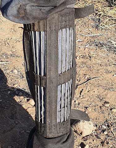 Espinillera con 11 varillas de acero galvanizado de 26 cm de largo por 2.5 mm de grosor; arnés con cinta de polipropileno de 1.5”, 3 tensores longitudinales concinta de polipropileno de 1”, tensor transversal con doble cinta de polipropileno de 1” para sujetar las varillas, área de protección de 26cm X 14cm, cinta superior para ajuste a la pierna de 48-49cms. cinta inferior para ajuste al tobillo de 41-42 cms, hebilla fundida de zinc, marca Hawaii, fabricada en Guatemala.